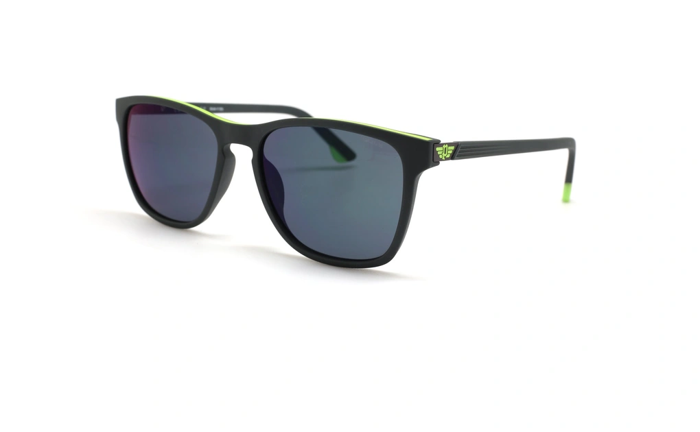 عینک آفتابی پلیس فریم کائوچویی مربعی مشکی و سبز فسفری و عدسی سورمه ای - عکس از زاویه سه رخ