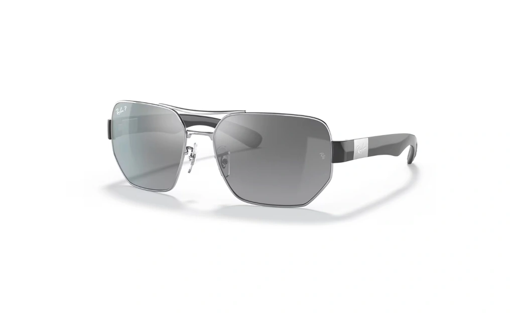 عینک آفتابی چند ضلعی دو پل پلاریزه ری بن فریم فلزی نقره ای براق به همراه عدسی دودی - عکس از زاویه سه رخ