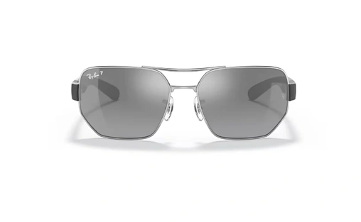 عینک آفتابی چند ضلعی دو پل پلاریزه ری بن فریم فلزی نقره ای براق به همراه عدسی دودی - عکس از زاویه روبرو