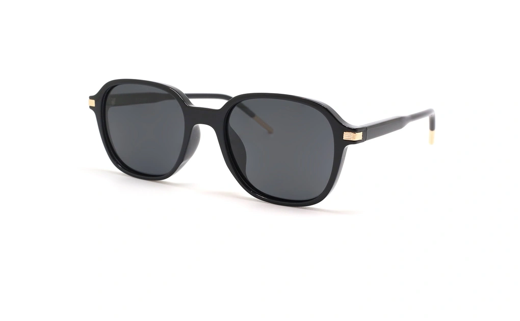 عینک آفتابی کائوچویی شبیه مستطیلی پلاریزه لنا فریم مشکی انتهای دسته طلایی عدسی مشکی - عکس از زاویه کنار