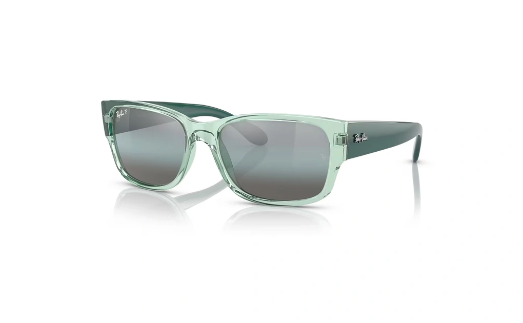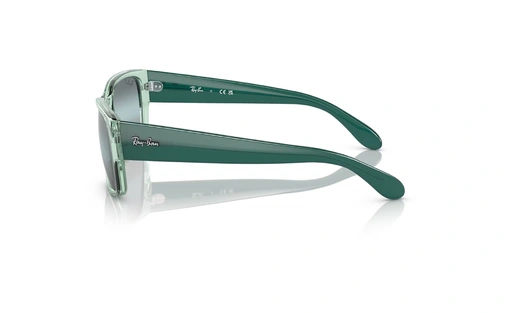 عینک آفتابی پلاریزه مستطیلی ری‌بن فریم کائوچویی سبز شفاف دسته ها سبز براق همراه عدسی آبی جیوه ای - عکس از زاویه کنار