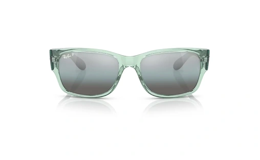 عینک آفتابی پلاریزه مستطیلی ری‌بن فریم کائوچویی سبز شفاف دسته ها سبز براق همراه عدسی آبی جیوه ای - عکس از زاویه روبرو