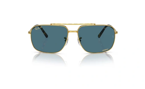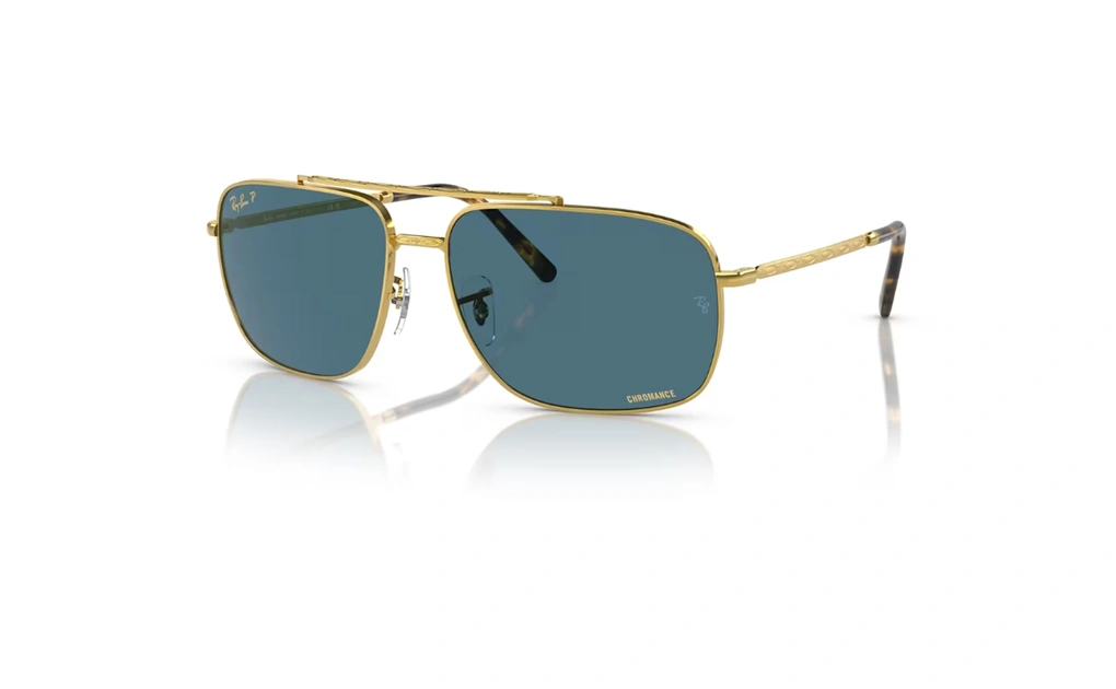 عینک آفتابی پلاریزه ری بن فریم فلزی دو پل طلایی براق به همراه عدسی آبی - عکس از زاویه سه رخ