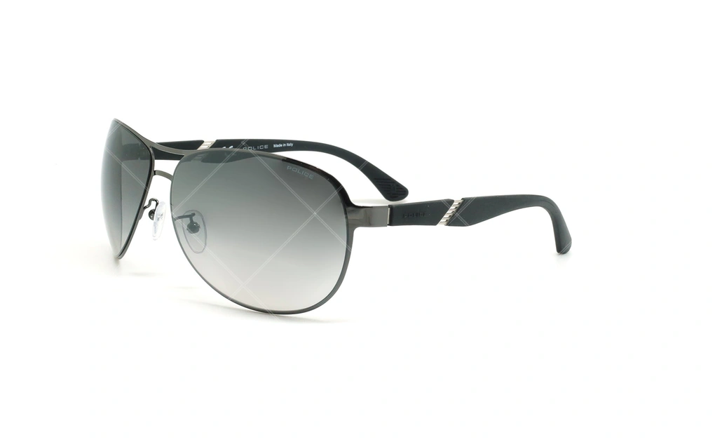 فریم فلزی این عینک با رنک نوک مدادی سیر در کنار شیشه های دودی جلوه زیبایی پیدا کرده است و همچنین دسته های کائوچویی این طرح که بسیار سبک و نرم بوده و نمایانگر لوگوی پلیس می باشد