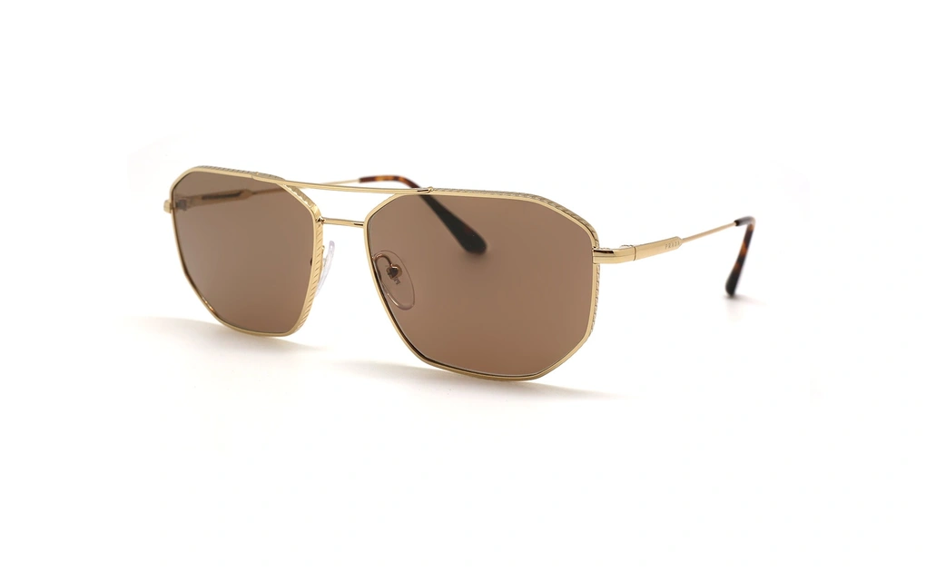 پرادا یک نام تجاری مد قدیمی و لوکس ایتالیایی با سابقه ای طولانی و پیشگام در ایده و طراحی آکسسواری می باشد که عینک های طبی و آفتابی نیز تولید می کند. پردا توانسته در طراحی عینک برزای آقایان متنوع و محبوب عمل کند و همین موضوع باعث شده است که درمیان آقایان به برند های محبوب و مورد علاقه شان تبدیل شود. پرادا همچنین برای خانم ها نیز عینک طراحی می کند و اتفاقا در عینک های زنانه نیز خوش سلیقه و منحصر به فرد عمل می کند. عینک آفتابی که در تصویر مشاهده میفرمایید یک عینک آفتابی چند وجهی مردانه به همراه عدسی قهوه ای و پل بینی دوتایی با فریم طلایی که دورتادور حدقه های فریم فلزی آن با خطوطی طراحی و تزیین شده است. این عینک آفتابی هم برای جمع ها و موقعیت های رسمی و هم غیر رسمی انتخاب مناسبی می باشد چه بسا که با انواع لباس ها از تیشرت های اُور سایز مردانه تا حتی کت و شلوار بدون شک شما را درخشان و متمایز خواهد کرد.